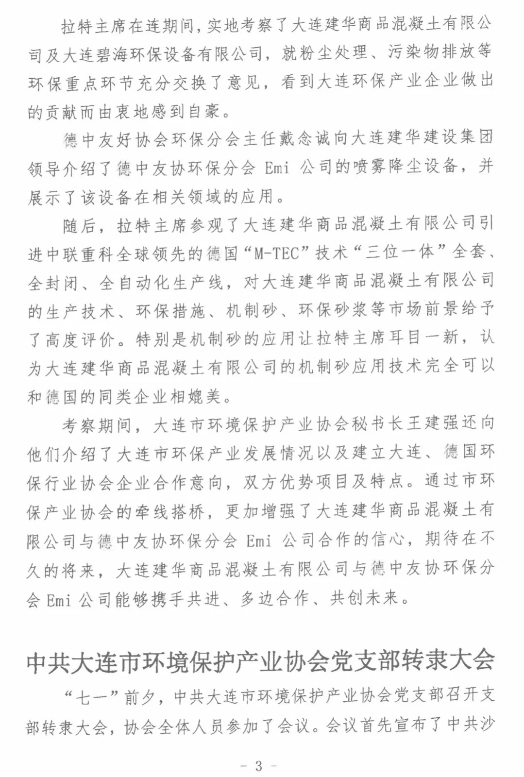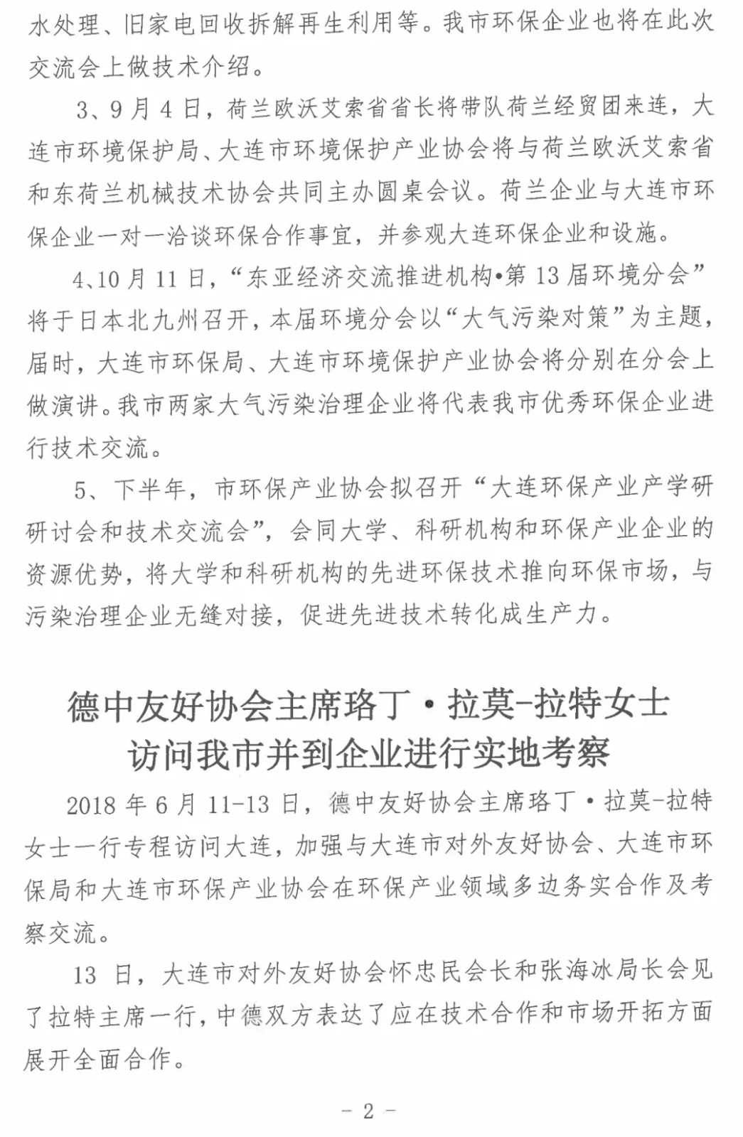 2018年6月30日,大连市环境保护产业协会主办的《大连环保产业简讯》(2018年第10期),刊发了题为《德中友好协会主席珞丁•拉莫-拉特女士访问我市并到企业进行实地考察》的简讯,对拉特主席参观考察大连九游网页版页面登入界面商品混凝土有限公司进行了重点报道。