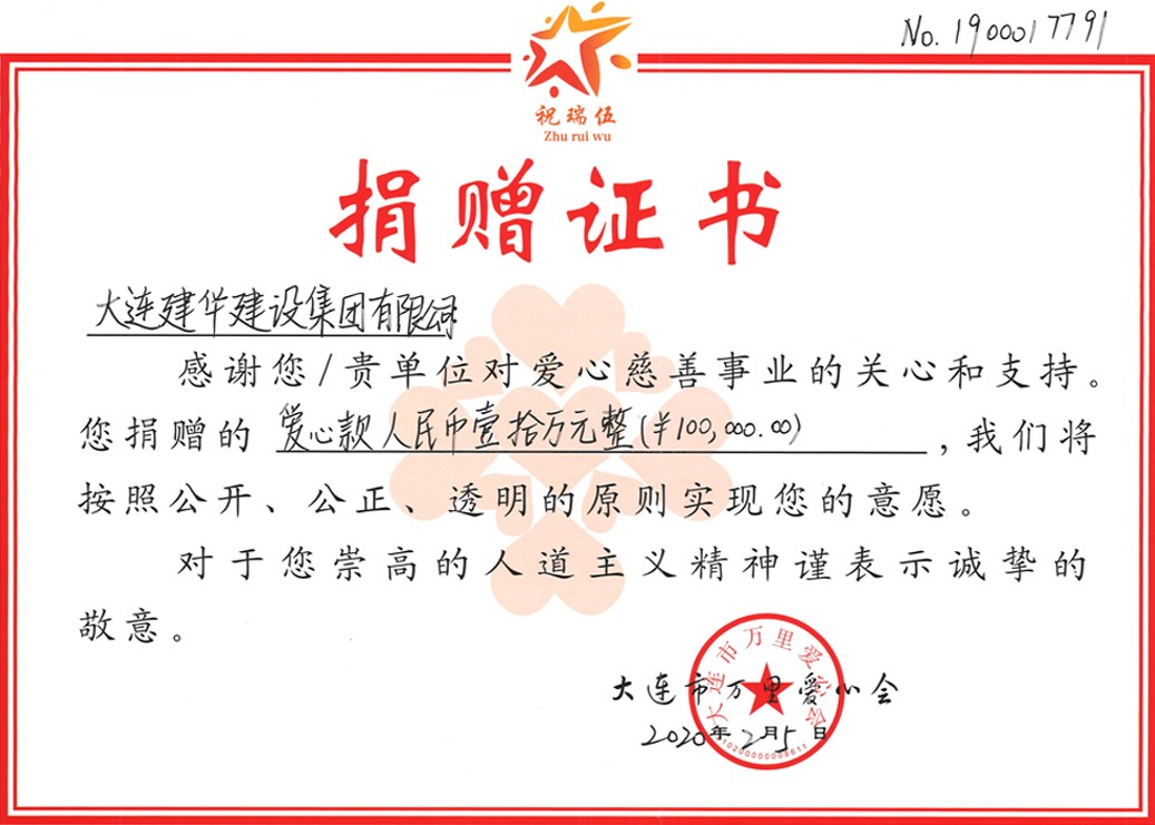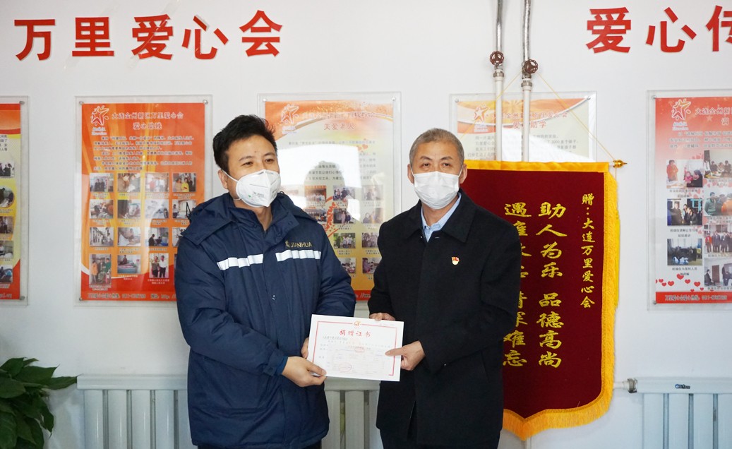 2月5日,在众志成城抗击新型冠状病毒肺炎疫情之时,大连九游网页版页面登入界面更是以高度的社会责任感,向大连市万里爱心会捐款10万元以及购置防护用品,用于慰问大连金普新区新型冠状病毒肺炎疫情防控的一线工作人员、志愿者以及为特困家庭开展的帮扶工作。金普新区文明办领导王晓慧、湾里街道纪工委书记王安民等相关负责人参加捐赠仪式。大连九游网页版页面登入界面总经办主任郑国强代表九游网页版页面登入界面接受了大连市万里爱心会会长祝瑞伍颁发的捐赠证书。